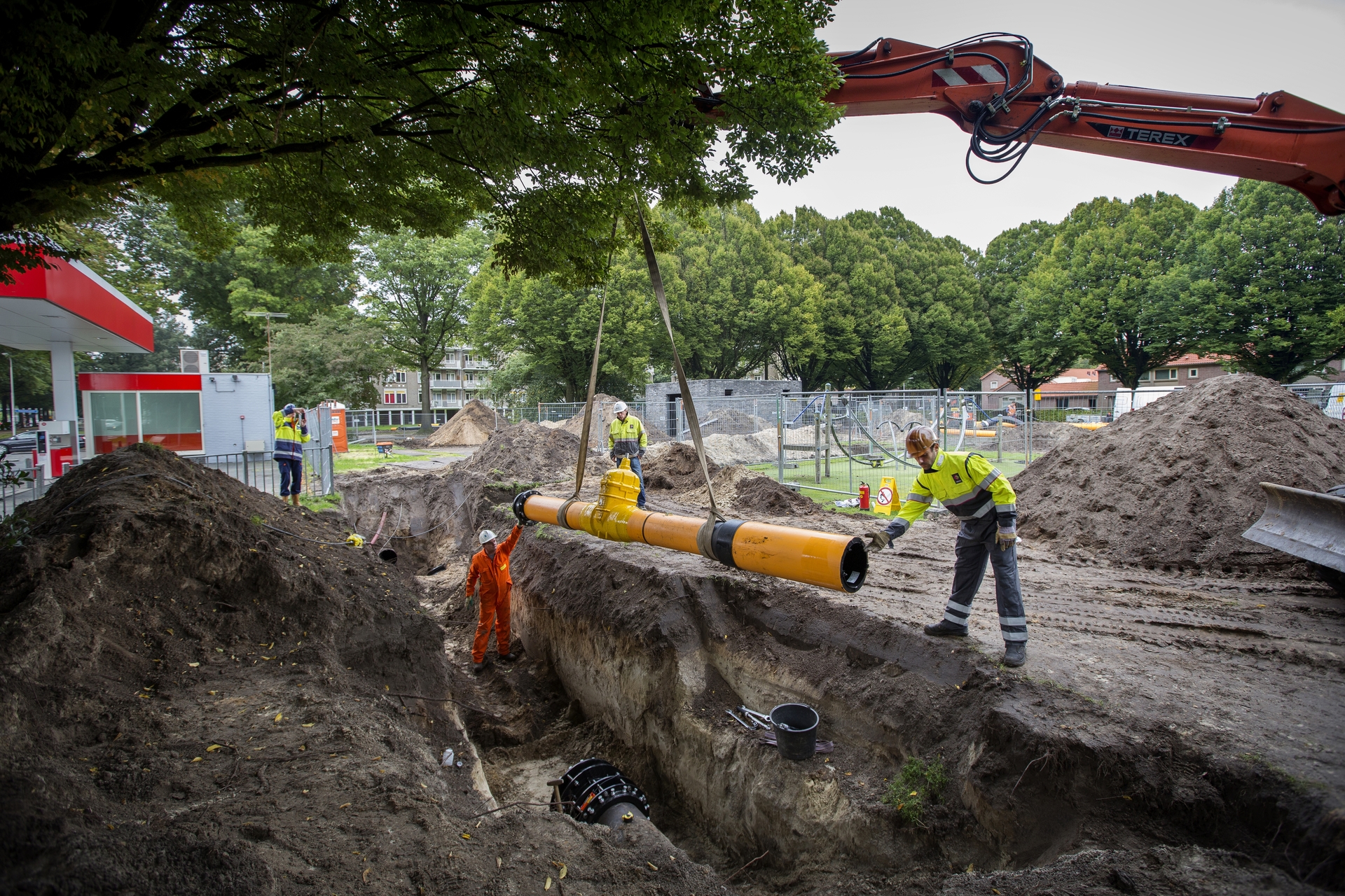 Vroeger groeven monteurs met de hand de leidingen op. Tegenwoordig doen ze dat echt niet meer. Een graafmachine doet het zware werk. De laatste schepjes gaan nog wél met de hand, want anders beschadig je de leiding.